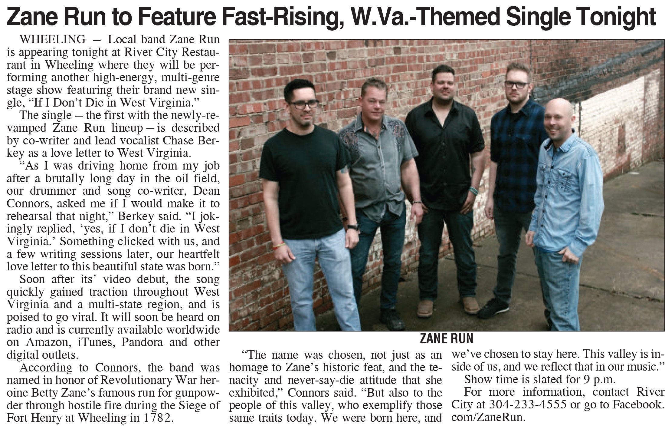From the Wheeling News-Register: WHEELING (Mar. 15, 2019) — Local band Zane Run is appearing tonight at River City Restaurant in Wheeling where they will be performing another high-energy, multi-genre stage show featuring their brand new single, “If I Don’t Die in West Virginia.”